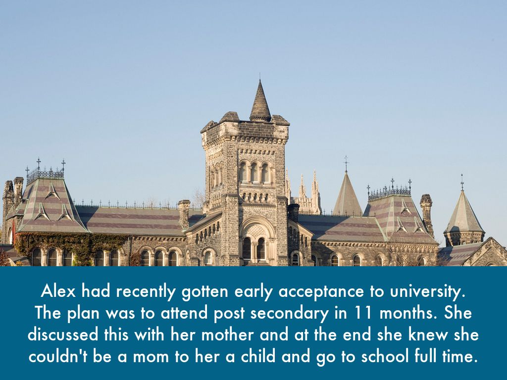 Alex had recently gotten early acceptance to university. The plan was to attend post secondary in 11 months. She discussed this with her mother and at the end she knew she couldn't be a mom to her a child and go to school full time.