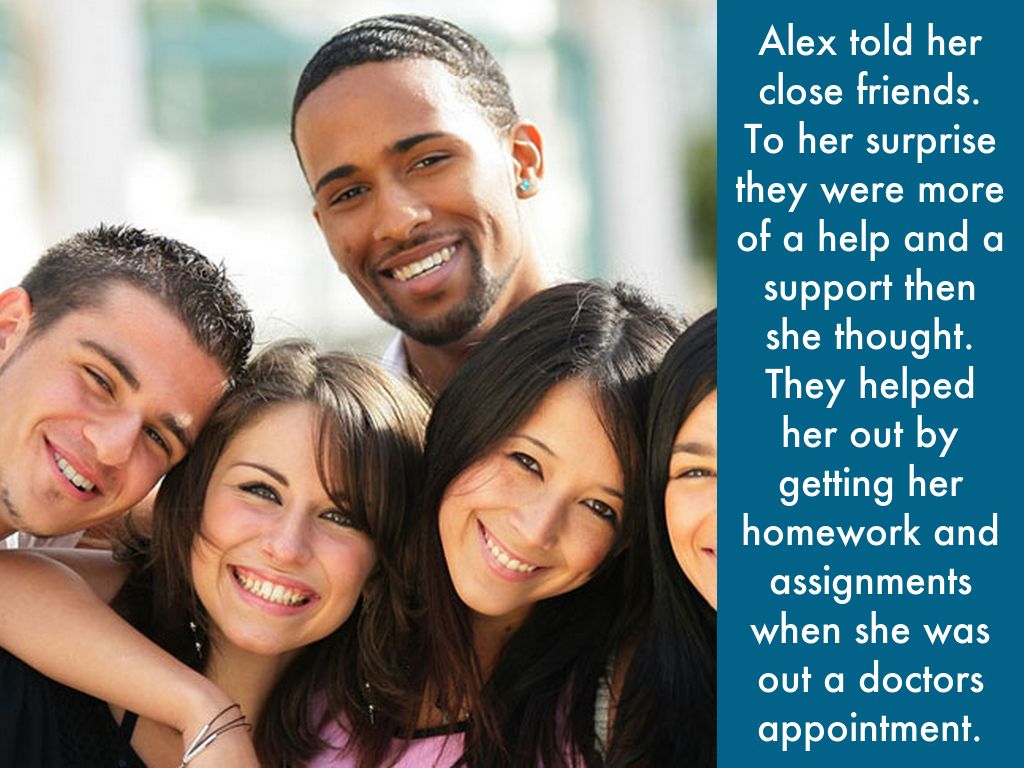 Alex told her close friends. To her surprise they were more of a help and a support then she thought. They helped her out by getting her homework and assignments when she was out a doctors appointment.