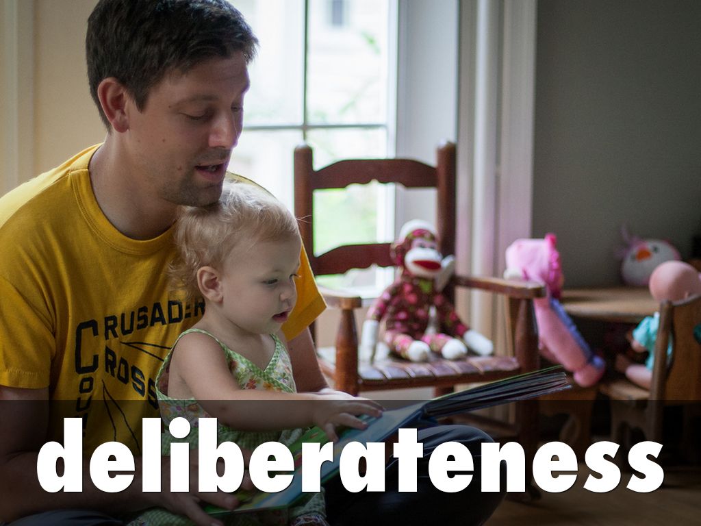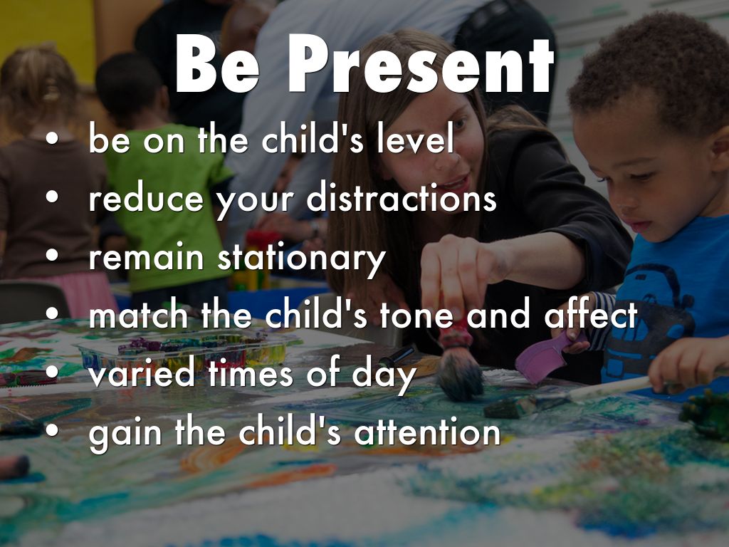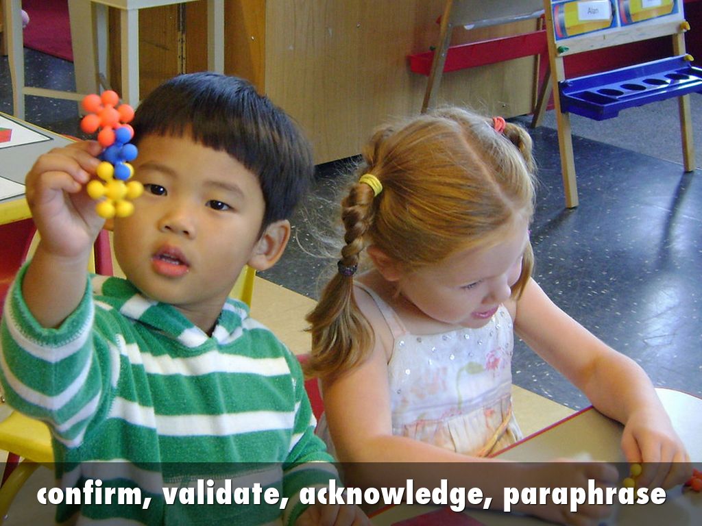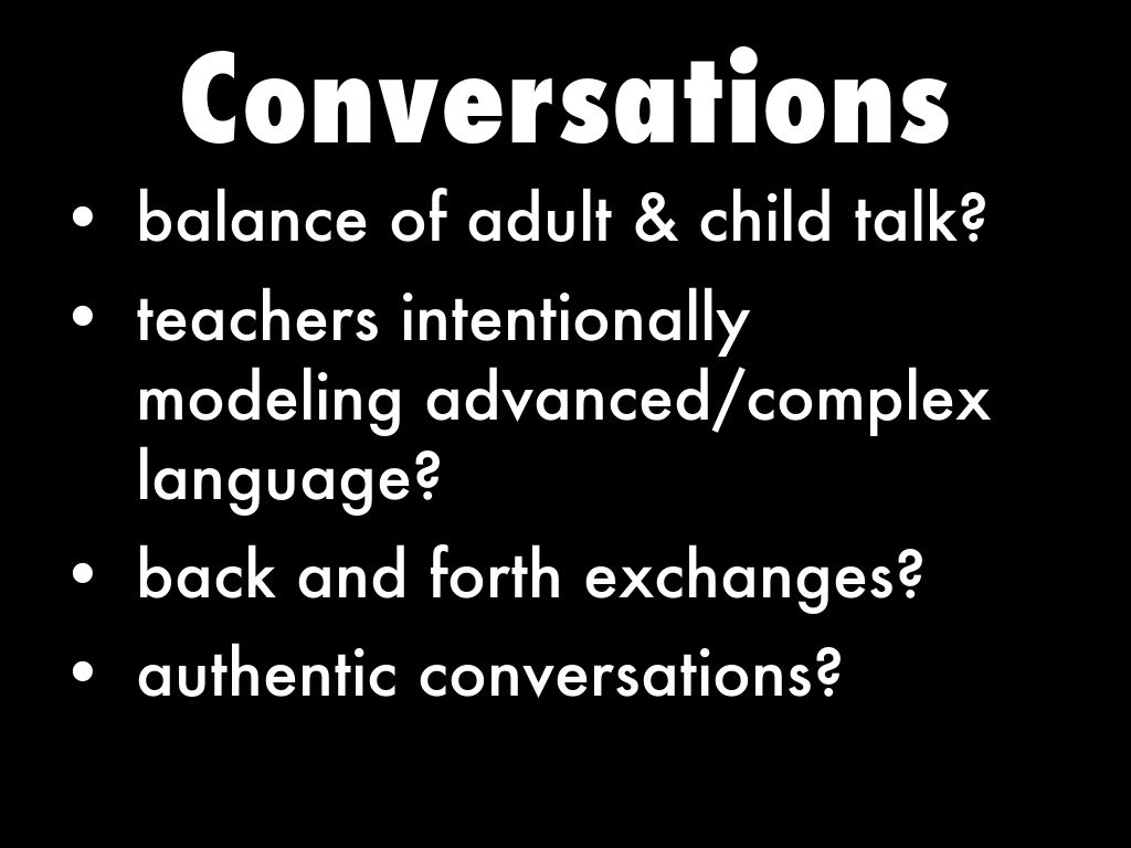 "Deliberateness means that the adults in the classroom are intentional in the language that they choose to use with children. When talking with children, adults in language-rich classroom environments make knowledgeable choices in the words, grammar, and sounds that they use so that they can stimulate children's ongoing achievement of new skills. Adults provide children with meaningful variation in the language to which they are exposed. For instance, when interacting with children, adults vary the abstraction level of the language that they use. Variations in the abstraction level allow children to participate in perceptually oriented conversations in which they use language to label, imitate, and describe, as well as in conceptually oriented conversations that engage children in using language to hypothesize, summarize, predict,