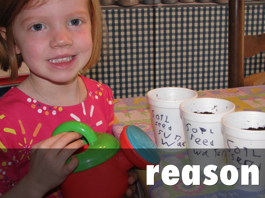Teacher: (asks a question that encourages the child to use language to express an abstract thought) “What would happen if the seeds did touch each other when you planted them?”