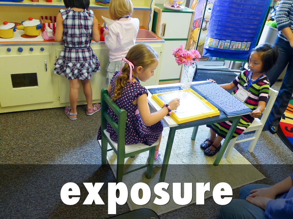 "Exposure means that children experience high-quality linguistic input both passively and actively within the classroom (Bunce, 1995). They are exposed to language throughout the day in diverse contexts and interactions. In