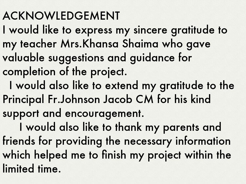 I would like to express my sincere gratitude to my teacher Mrs.Khansa Shaima who gave valuable suggestions and guidance for completion of the project.