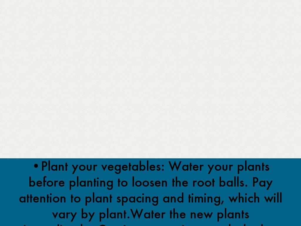 •Plant your vegetables: Water your plants before planting to loosen the root balls. Pay attention to plant spacing and timing, which will vary by plant.Water the new plants immediately. Continue watering regularly, but do not over water.