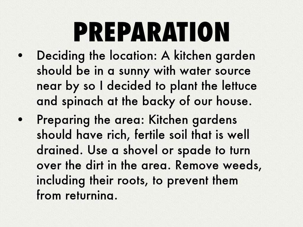 - Preparing the area: Kitchen gardens should have rich, fertile soil that is well drained. Use a shovel or spade to turn over the dirt in the area. Remove weeds, including their roots, to prevent them from returning.