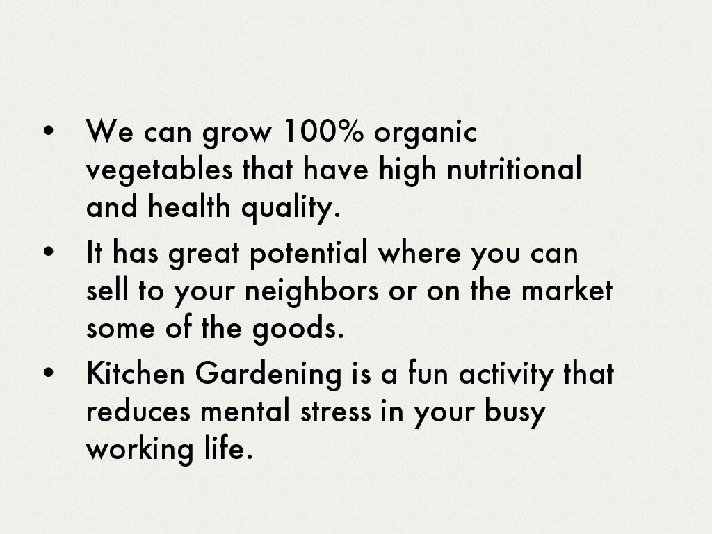 - Kitchen Gardening is a fun activity that reduces mental stress in your busy working life.