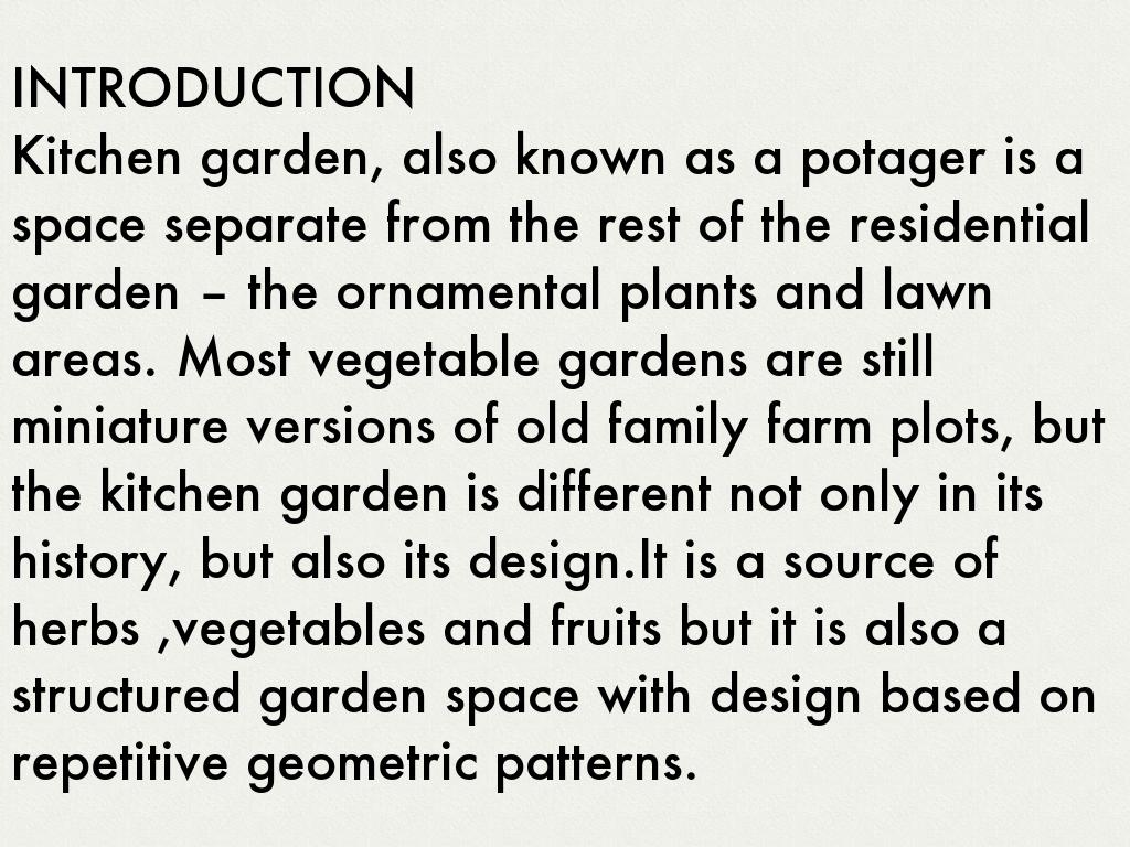 Kitchen garden, also known as a potager is a space separate from the rest of the residential garden – the ornamental plants and lawn areas. Most vegetable gardens are still miniature versions of old family farm plots, but the kitchen garden is different not only in its history, but also its design.It is a source of herbs ,vegetables and fruits but it is also a structured garden space with design based on repetitive geometric patterns.