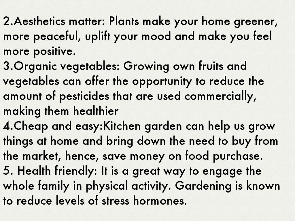 4.Cheap and easy:Kitchen garden can help us grow things at home and bring down the need to buy from the market, hence, save money on food purchase.
