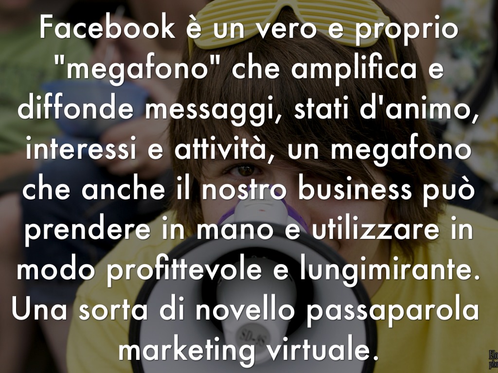 Facebook è un vero e proprio "megafono" che amplifica e diffonde messaggi, stati d'animo, interessi e attività, un megafono che anche il nostro business può prendere in mano e utilizzare in modo profittevole e lungimirante. Una sorta di novello passaparola marketing virtuale.