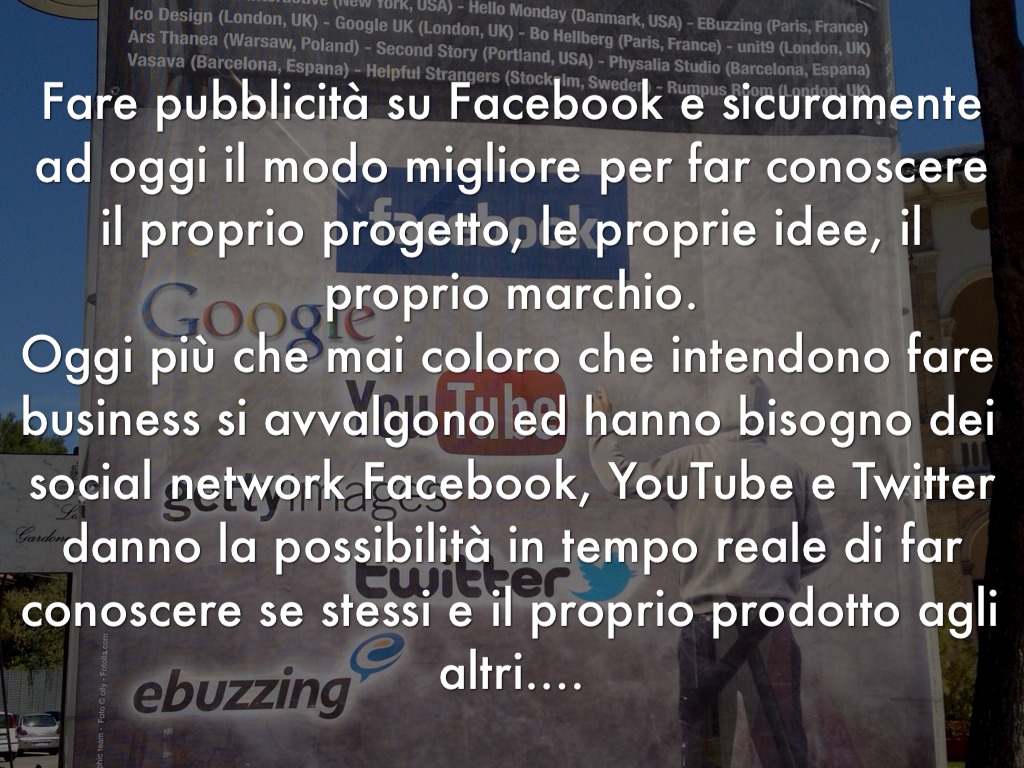 Fare pubblicità su Facebook e sicuramente ad oggi il modo migliore per far conoscere il proprio progetto, le proprie idee, il proprio marchio. Oggi più che mai coloro che intendono fare business si avvalgono ed hanno bisogno dei social network Facebook, YouTube e Twitter danno la possibilità in tempo reale di far conoscere se stessi e il proprio prodotto agli altri.