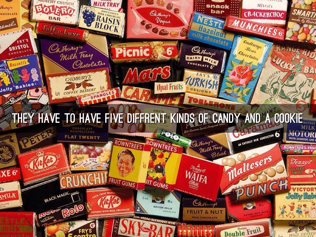 THEY HAVE TO HAVE FIVE DIFFRENT KINDS OF CANDY AND A COOKIE