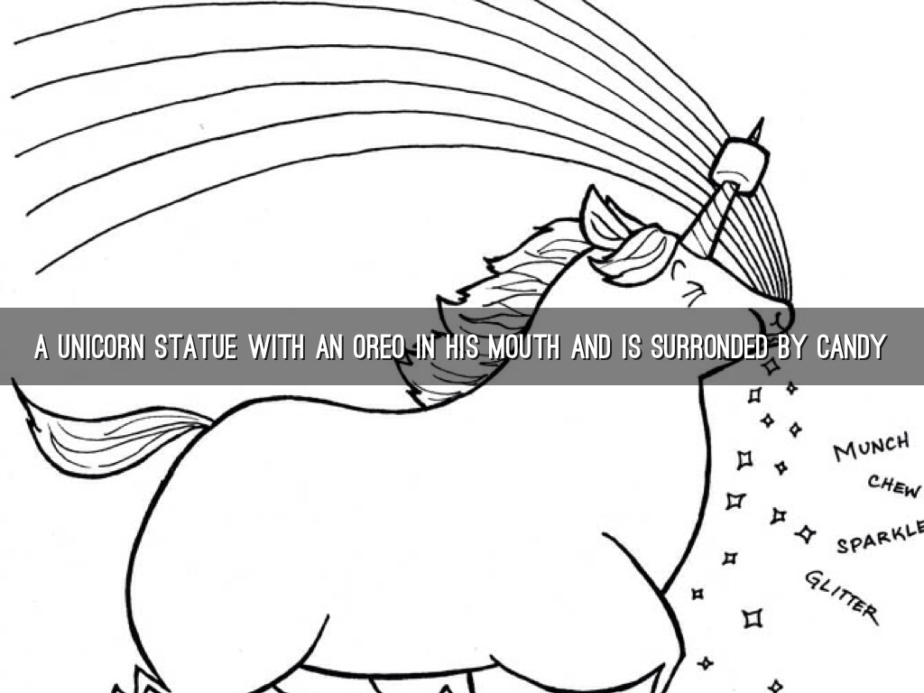 A UNICORN STATUE WITH AN OREO IN HIS MOUTH AND IS SURRONDED BY CANDY