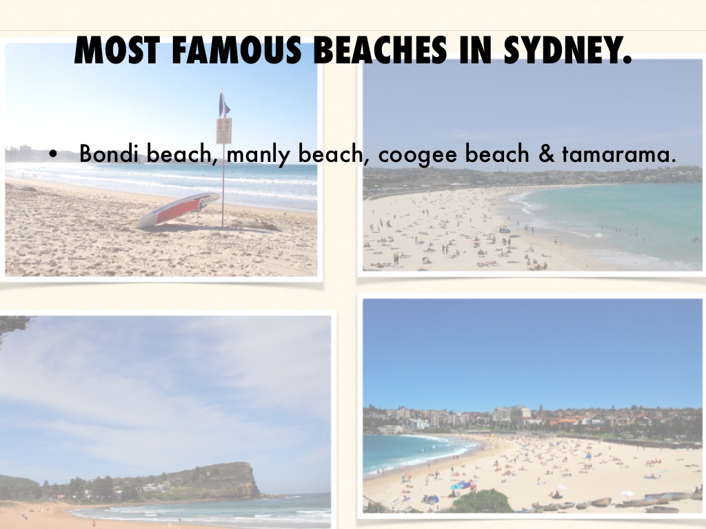 - Bondi beach, manly beach, coogee beach & tamarama.