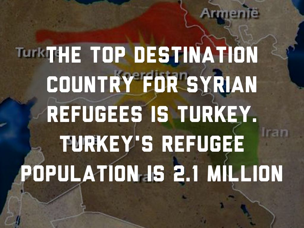 The top destination country for Syrian refugees is Turkey. Turkey's refugee population is 2.1 million