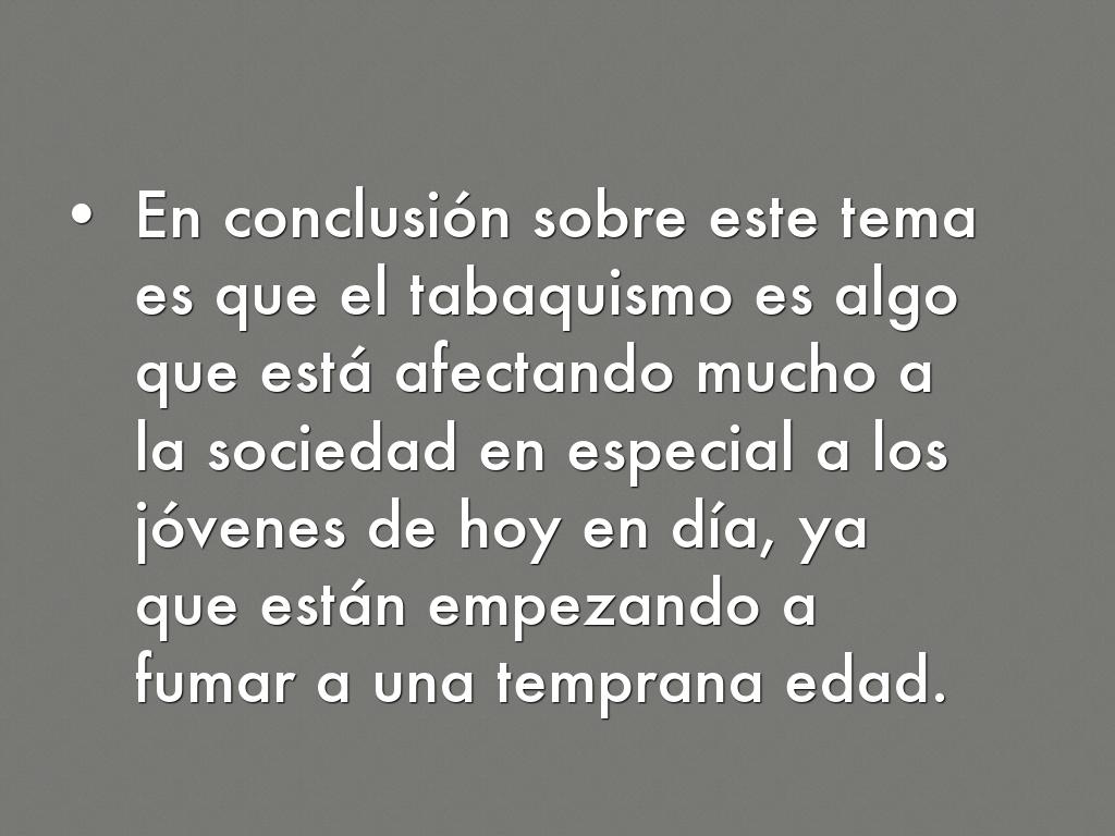 En conclusión sobre este tema es que el tabaquismo es algo que está afectando mucho a la sociedad en especial a los jóvenes de hoy en día, ya que están empezando a fumar a una temprana edad.