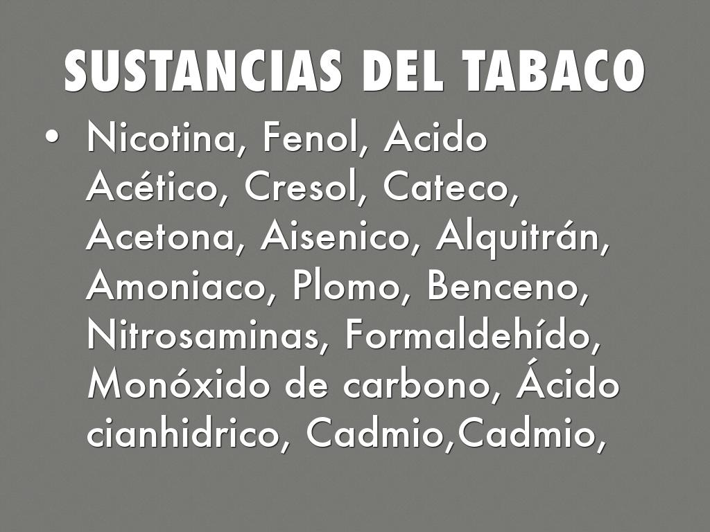 Nicotina, Fenol, Acido Acético, Cresol, Cateco, Acetona, Aisenico, Alquitrán, Amoniaco, Plomo, Benceno, Nitrosaminas, Formaldehído, Monóxido de carbono, Ácido cianhidrico, Cadmio,Cadmio,