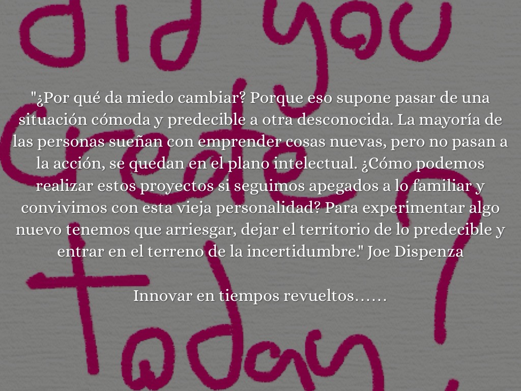 "¿Por qué da miedo cambiar? Porque eso supone pasar de una situación cómoda y predecible a otra desconocida. La mayoría de las personas sueñan con emprender cosas nuevas, pero no pasan a la acción, se quedan en el plano intelectual. ¿Cómo podemos realizar estos proyectos si seguimos apegados a lo familiar y convivimos con esta vieja personalidad? Para experimentar algo nuevo tenemos que arriesgar, dejar el territorio de lo predecible y entrar en el terreno de la incertidumbre." Joe Dispenza