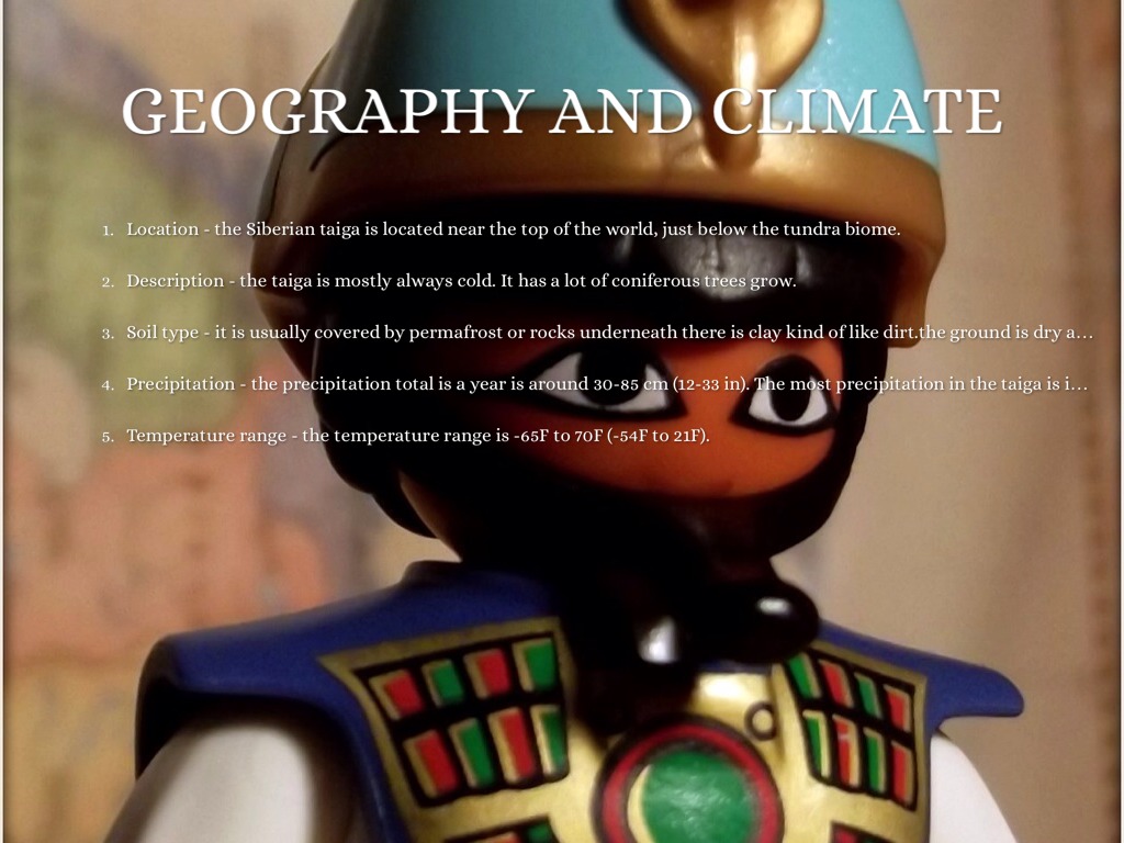 Location - the Siberian taiga is located near the top of the world, just below the tundra biome.