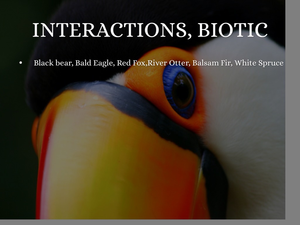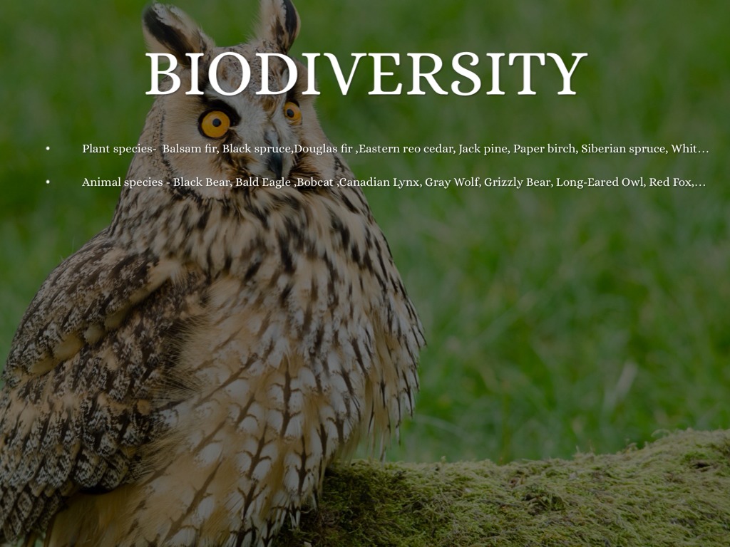 Animal species - Black Bear, Bald Eagle ,Bobcat ,Canadian Lynx, Gray Wolf, Grizzly Bear, Long-Eared Owl, Red Fox, River Otter,Snow Shoe Rabbit, Wolverine