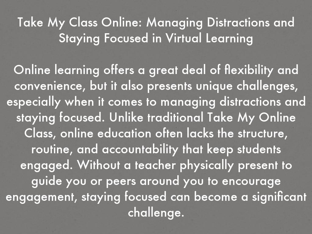 Online learning offers a great deal of flexibility and convenience, but it also presents unique challenges, especially when it comes to managing distractions and staying focused. Unlike traditional Take My Online Class, online education often lacks the structure, routine, and accountability that keep students engaged. Without a teacher physically present to guide you or peers around you to encourage engagement, staying focused can become a significant challenge.