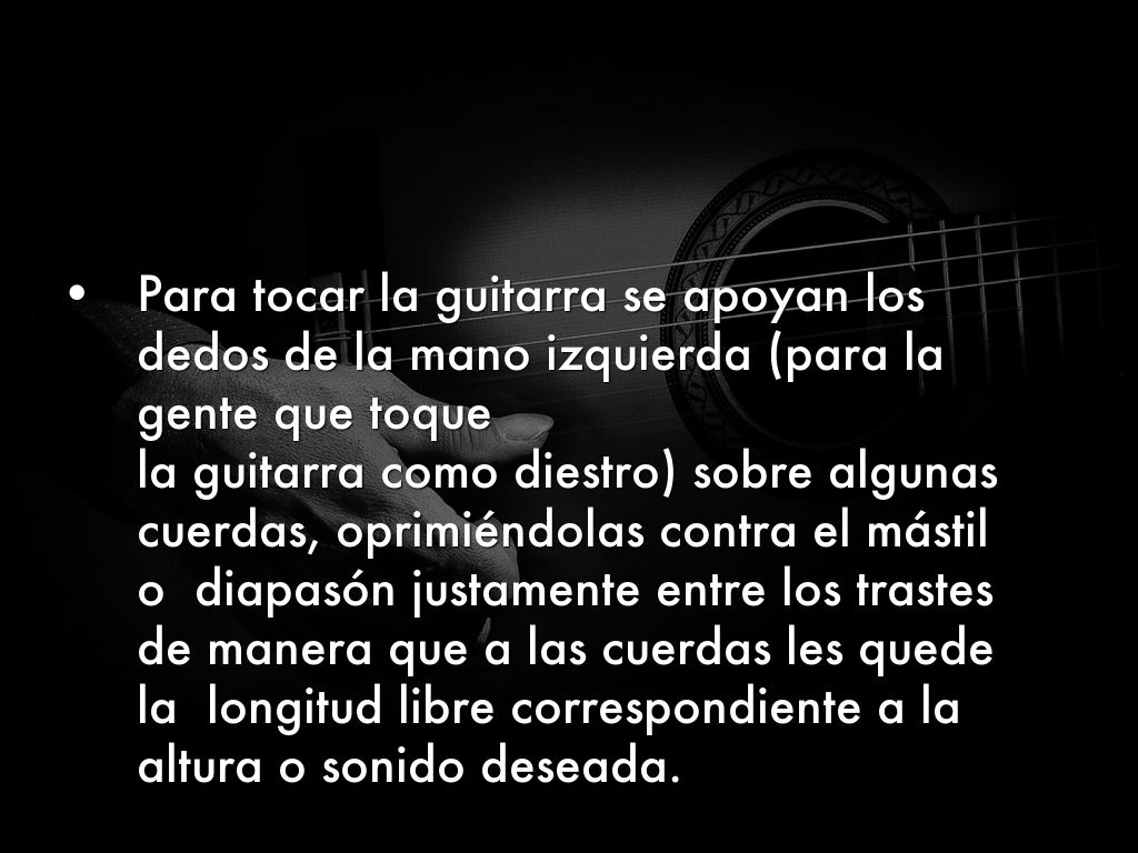 • Para tocar la guitarra se apoyan los dedos de la mano izquierda (para la gente que toque la guitarra como diestro) sobre algunas cuerdas, oprimiéndolas contra el mástil o diapasón justamente entre los trastes de manera que a las cuerdas les quede la longitud libre correspondiente a la altura o sonido deseada.