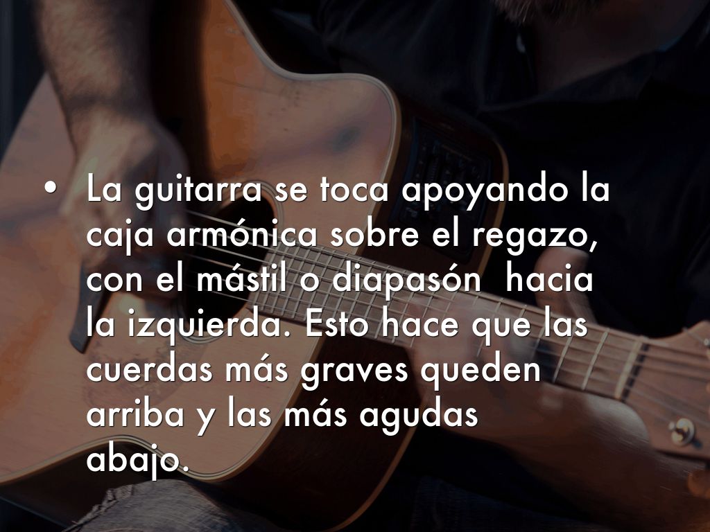• La guitarra se toca apoyando la caja armónica sobre el regazo, con el mástil o diapasón hacia la izquierda. Esto hace que las cuerdas más graves queden arriba y las más agudas abajo.