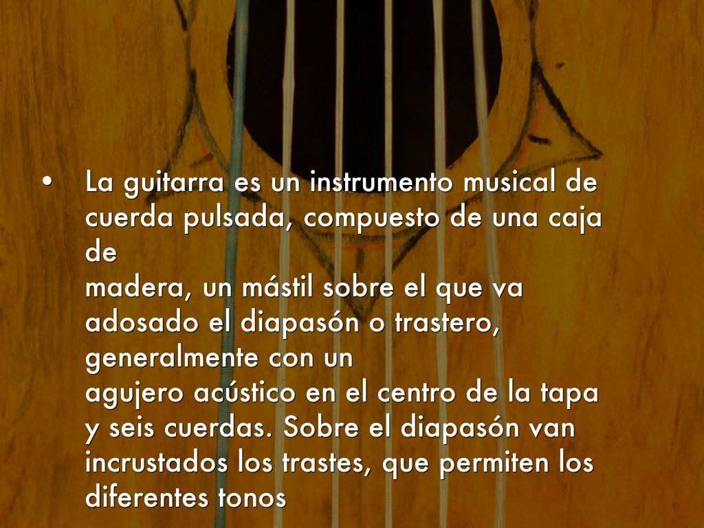 • La guitarra es un instrumento musical de cuerda pulsada, compuesto de una caja de madera, un mástil sobre el que va adosado el diapasón o trastero, generalmente con un agujero acústico en el centro de la tapa y seis cuerdas. Sobre el diapasón van incrustados los trastes, que permiten los diferentes tonos