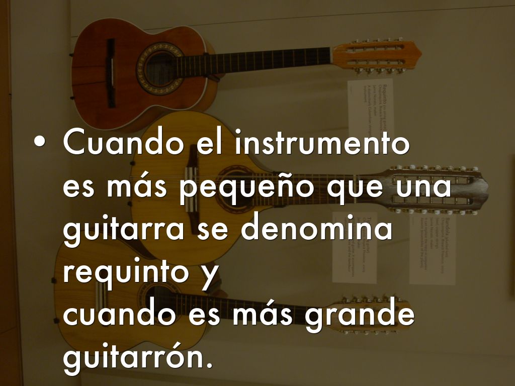 • Cuando el instrumento es más pequeño que una guitarra se denomina requinto y cuando es más grande guitarrón.