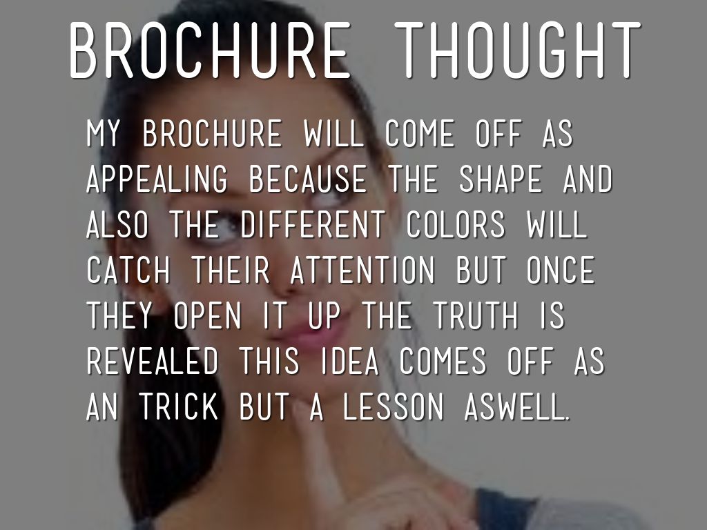 my brochure will come off as appealing because the shape and also the different colors will catch their attention but once they open it up the truth is revealed this idea comes off as an trick but a lesson aswell.