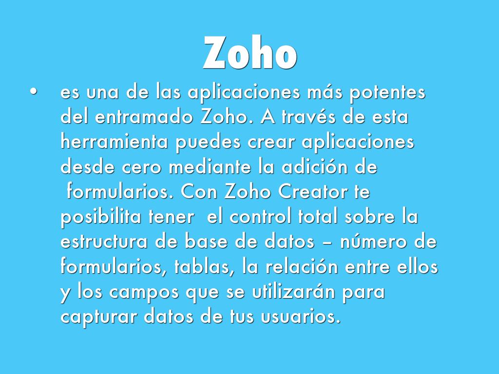 es una de las aplicaciones más potentes del entramado Zoho. A través de esta herramienta puedes crear aplicaciones desde cero mediante la adición de formularios. Con Zoho Creator te posibilita tener el control total sobre la estructura de base de datos – número de formularios, tablas, la relación entre ellos y los campos que se utilizarán para capturar datos de tus usuarios.