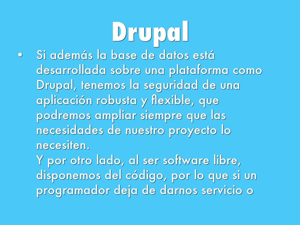 Si además la base de datos está desarrollada sobre una plataforma como Drupal, tenemos la seguridad de una aplicación robusta y flexible, que podremos ampliar siempre que las necesidades de nuestro proyecto lo necesiten.