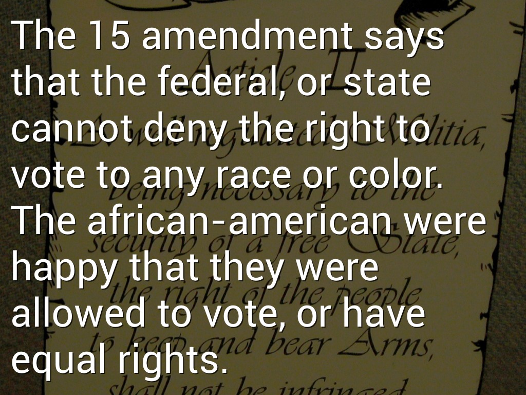 The 15 amendment says that the federal, or state cannot deny the right to vote to any race or color. The african-american were happy that they were allowed to vote, or have equal rights.