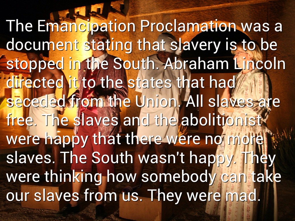 The Emancipation Proclamation was a document stating that slavery is to be stopped in the South. Abraham Lincoln directed it to the states that had seceded from the Union. All slaves are free. The slaves and the abolitionist were happy that there were no more slaves. The South wasn't happy. They were thinking how somebody can take our slaves from us. They were mad.