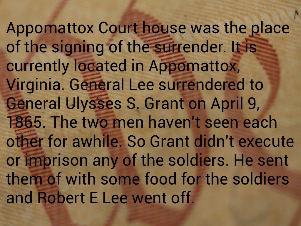Appomattox Court house was the place of the signing of the surrender. It is currently located in Appomattox, Virginia. General Lee surrendered to General Ulysses S. Grant on April 9, 1865. The two men haven't seen each other for awhile. So Grant didn't execute or imprison any of the soldiers. He sent them of with some food for the soldiers and Robert E Lee went off.