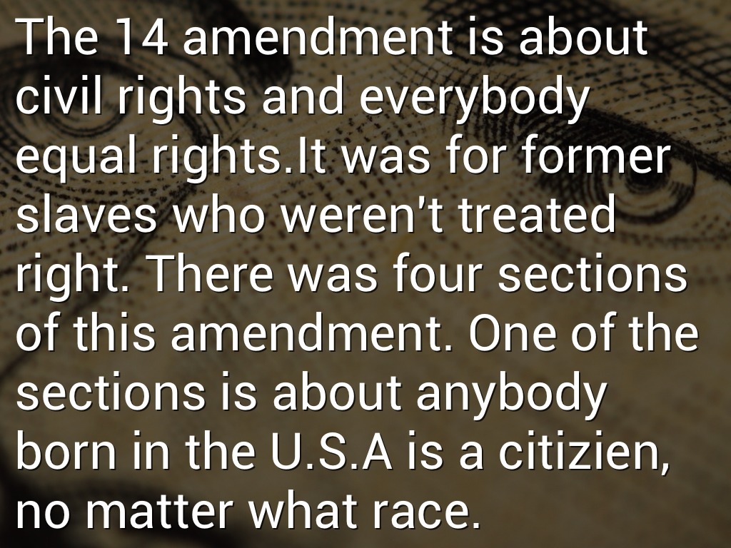 The 14 amendment is about civil rights and everybody equal rights.It was for former slaves who weren't treated right. There was four sections of this amendment. One of the sections is about anybody born in the U.S.A is a citizien, no matter what race.