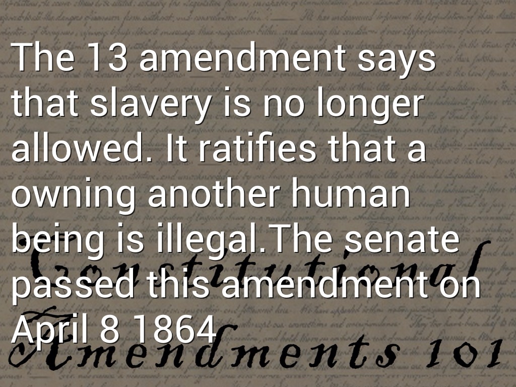 The 13 amendment says that slavery is no longer allowed. It ratifies that a owning another human being is illegal.The senate passed this amendment on April 8 1864