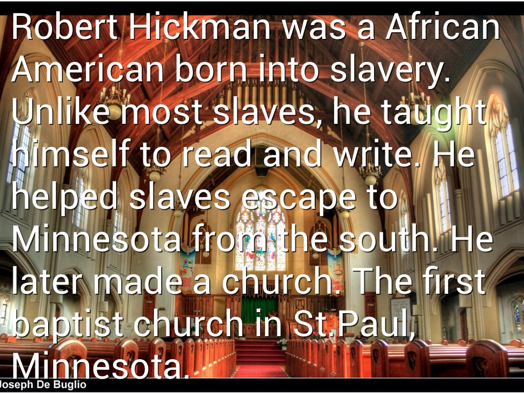 Robert Hickman was a African American born into slavery. Unlike most slaves, he taught himself to read and write. He helped slaves escape to Minnesota from the south. He later made a church. The first baptist church in St.Paul, Minnesota.