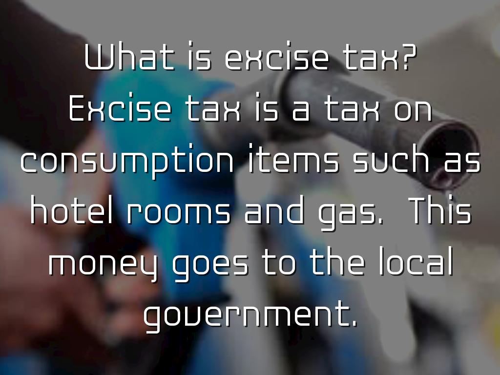 Excise tax is a tax on consumption items such as hotel rooms and gas. This money goes to the local government.