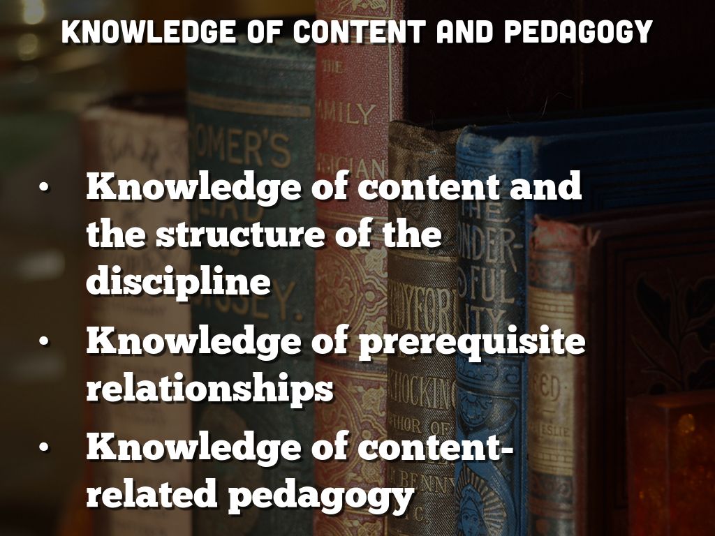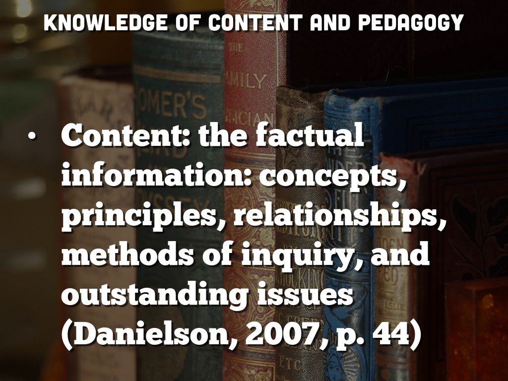 Content: the factual information: concepts, principles, relationships, methods of inquiry, and outstanding issues (Danielson, 2007, p. 44)