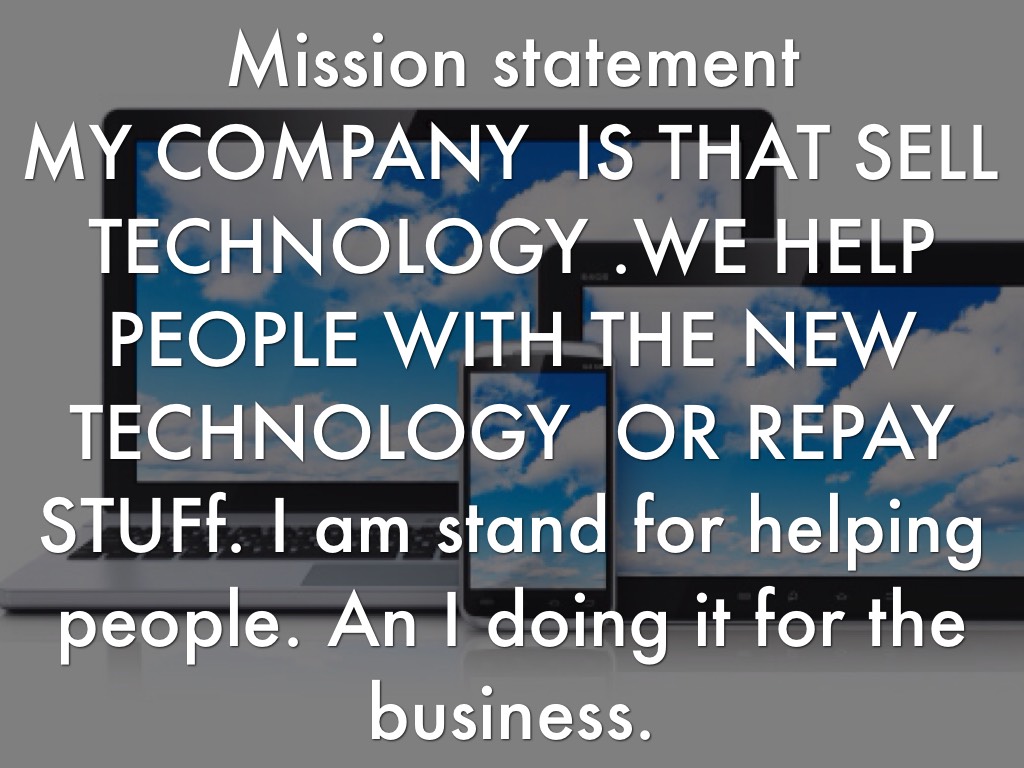 MY COMPANY IS THAT SELL TECHNOLOGY .WE HELP PEOPLE WITH THE NEW TECHNOLOGY OR REPAY STUFf. I am stand for helping people. An I doing it for the business.