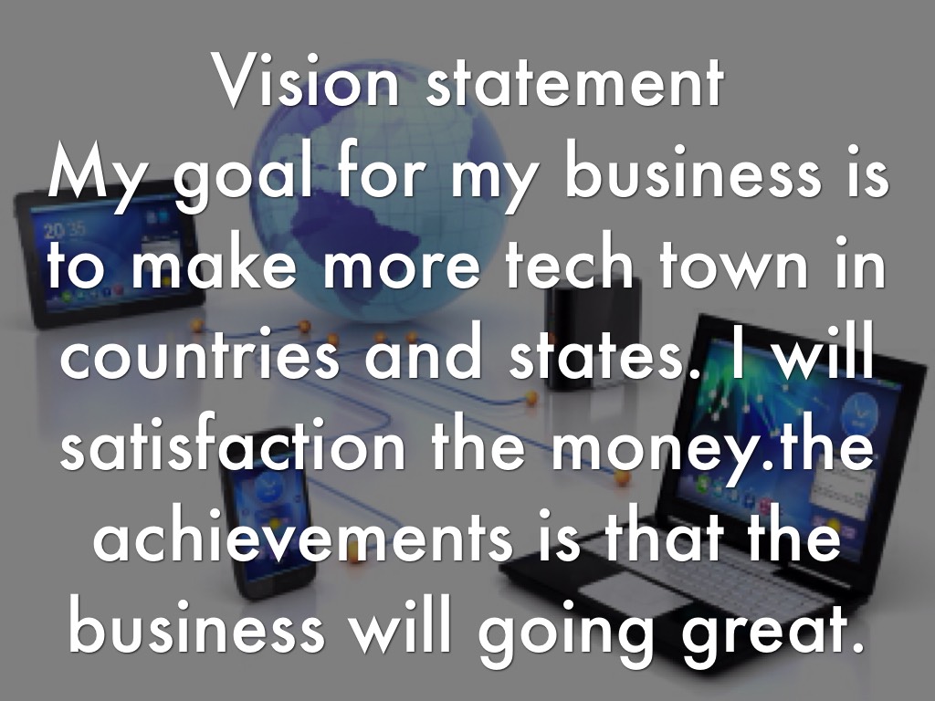 My goal for my business is to make more tech town in countries and states. I will satisfaction the money.the achievements is that the business will going great.