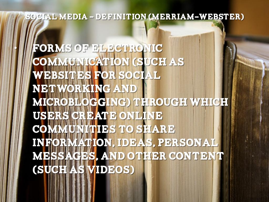 forms of electronic communication (such as websites for social networking and microblogging) through which users create online communities to share information, ideas, personal messages, and other content (such as videos)