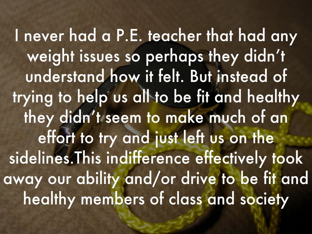 I never had a P.E. teacher that had any weight issues so perhaps they didn’t understand how it felt. But instead of trying to help us all to be fit and healthy they didn’t seem to make much of an effort to try and just left us on the sidelines.This indifference effectively took away our ability and/or drive to be fit and healthy members of class and society