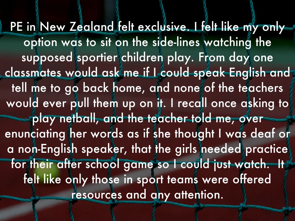 PE in New Zealand felt exclusive. I felt like my only option was to sit on the side-lines watching the supposed sportier children play. From day one classmates would ask me if I could speak English and tell me to go back home, and none of the teachers would ever pull them up on it. I recall once asking to play netball, and the teacher told me, over enunciating her words as if she thought I was deaf or a non-English speaker, that the girls needed practice for their after school game so I could just watch. It felt like only those in sport teams were offered resources and any attention.