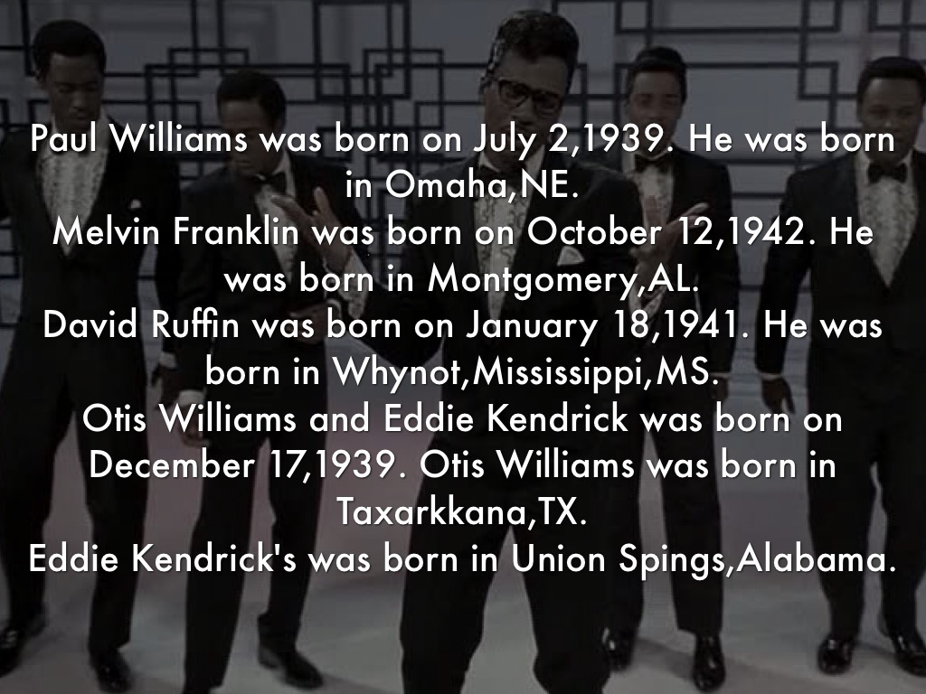 Paul Williams was born on July 2,1939. He was born in Omaha,NE. Melvin Franklin was born on October 12,1942. He was born in Montgomery,AL. David Ruffin was born on January 18,1941. He was born in Whynot,Mississippi,MS. Otis Williams and Eddie Kendrick was born on December 17,1939. Otis Williams was born in Taxarkkana,TX. Eddie Kendrick's was born in Union Spings,Alabama.