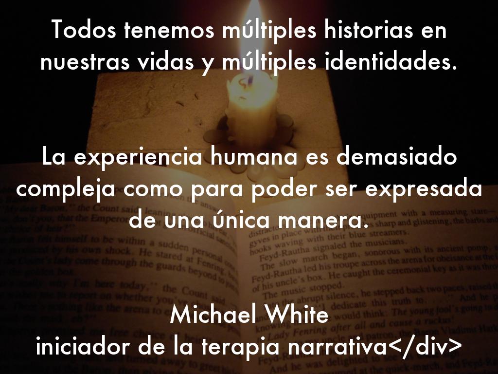 La Terapia Narrativa es una manera de trabajar con personas y relaciones que nace en los años '80 en Australia y Nueva Zelanda, con Michael White y David Epston como iniciadores.