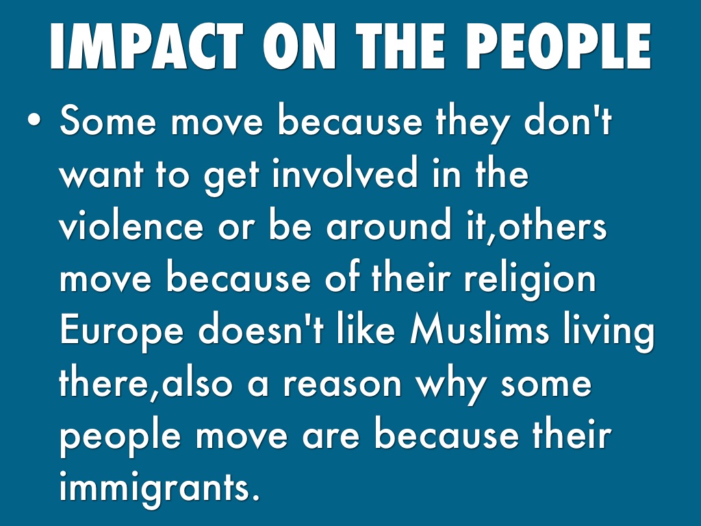 Some move because they don't want to get involved in the violence or be around it,others move because of their religion Europe doesn't like Muslims living there,also a reason why some people move are because their immigrants.