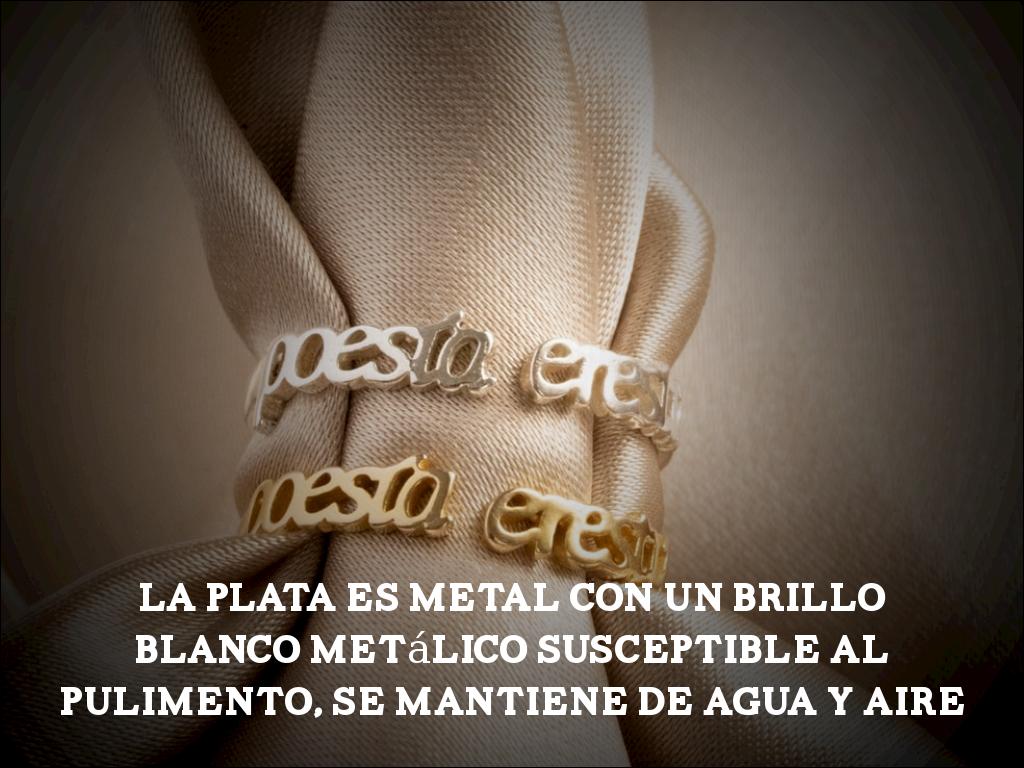La plata es metaL con un brillo blanco metálico susceptible al pulimento, se mantiene de agua y aire
