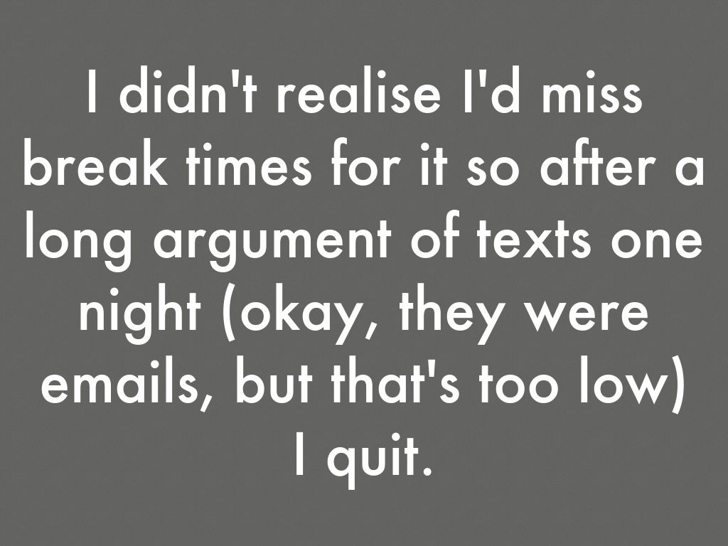I didn't realise I'd miss break times for it so after a long argument of texts one night (okay, they were emails, but that's too low)