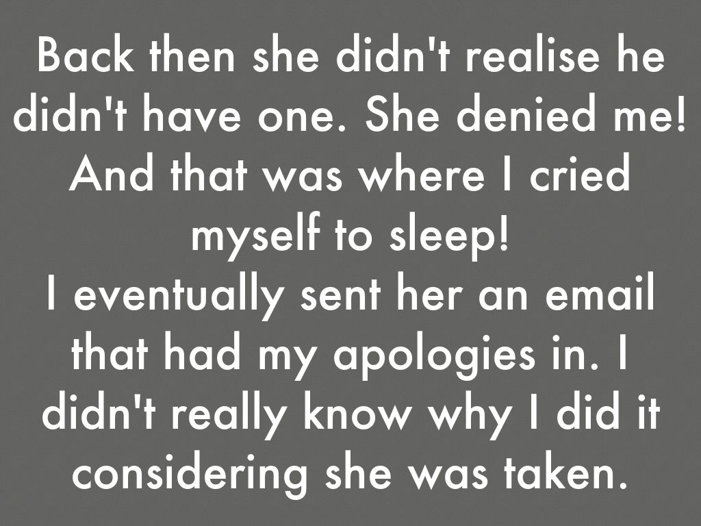 Back then she didn't realise he didn't have one. She denied me! And that was where I cried myself to sleep!