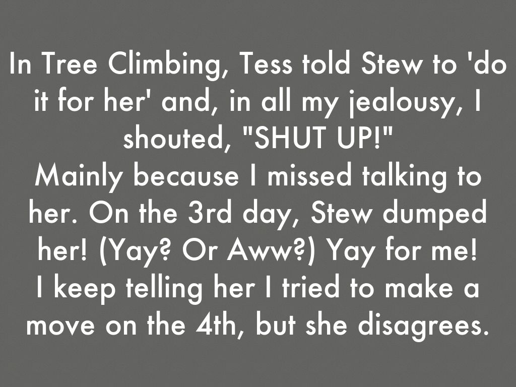 In Tree Climbing, Tess told Stew to 'do it for her' and, in all my jealousy, I shouted, "SHUT UP!"
